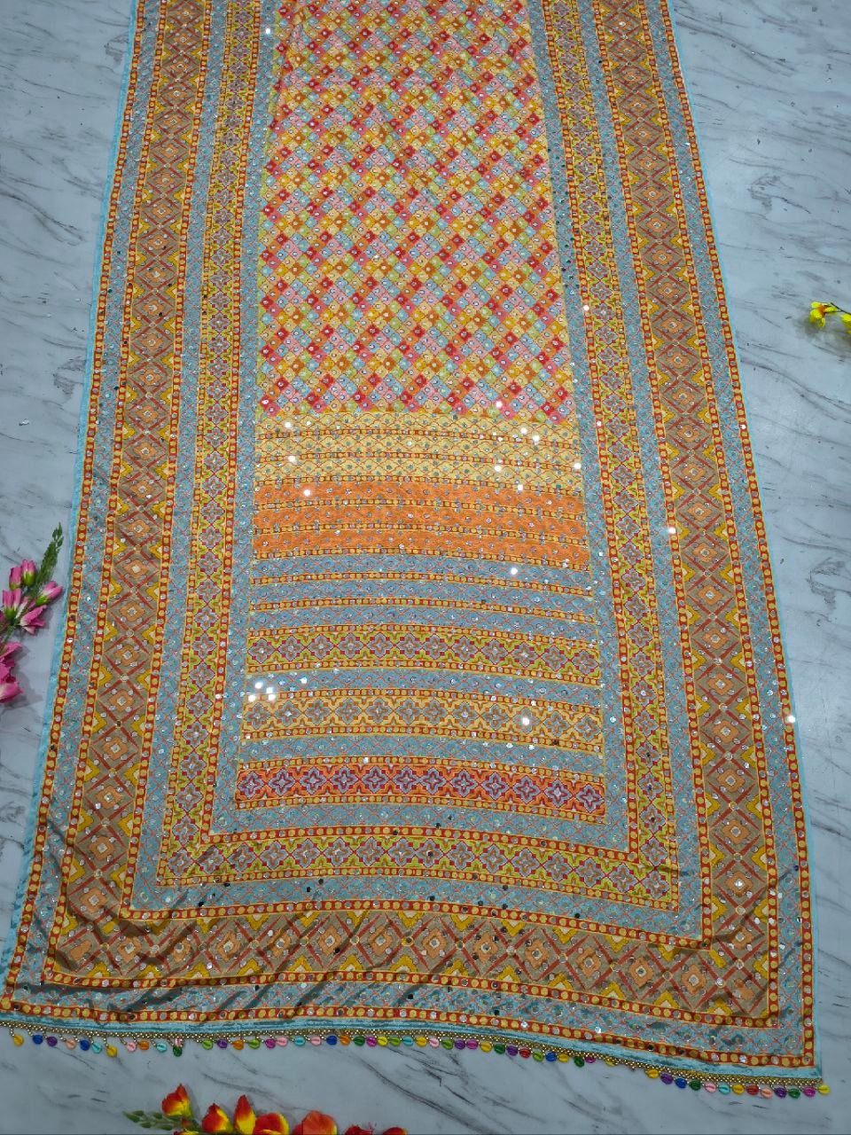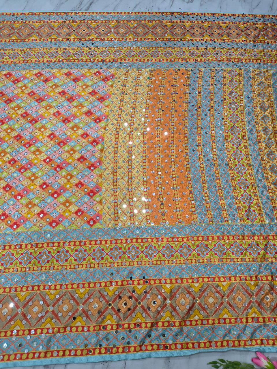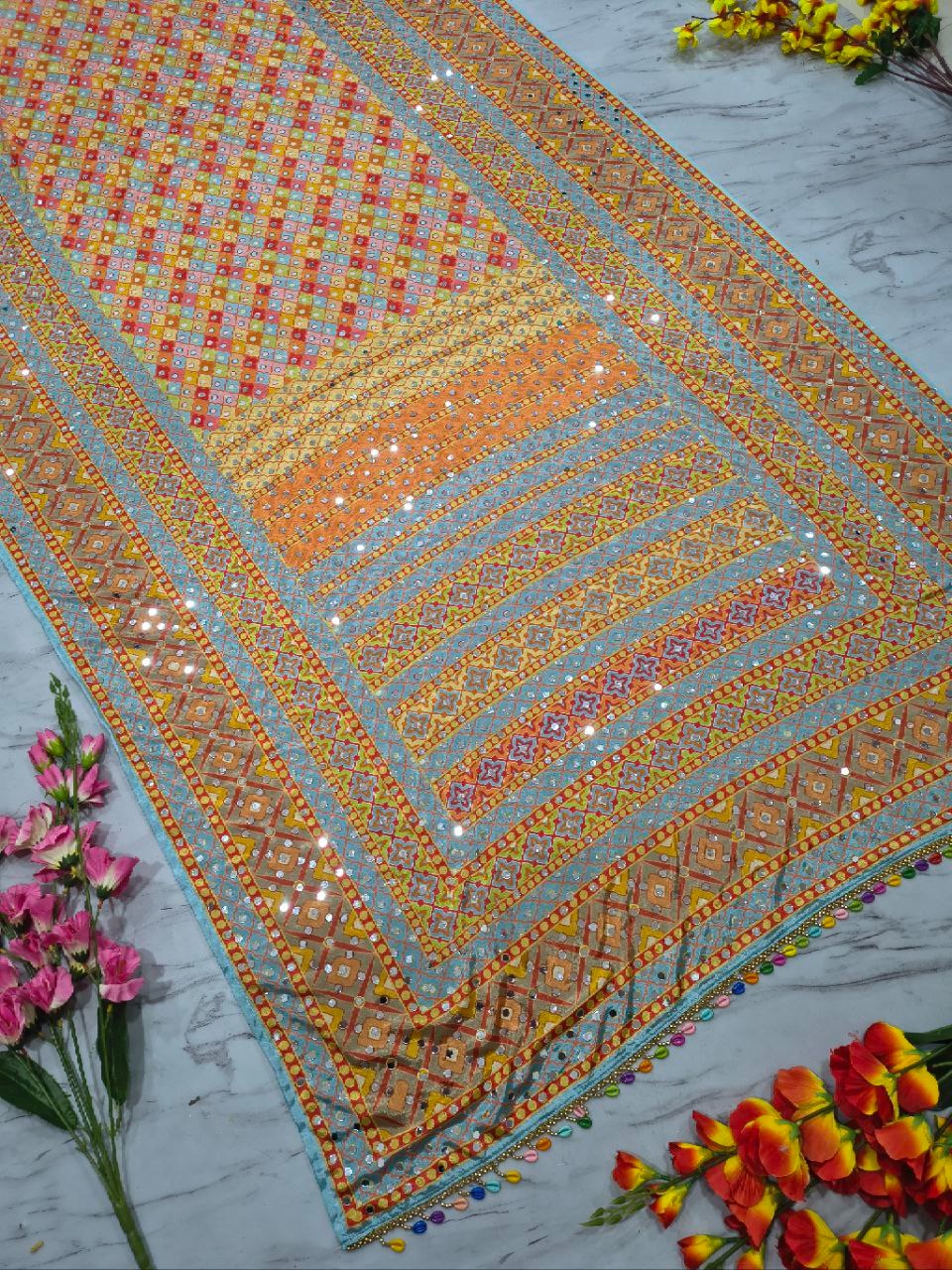 Premium Chinon Silk Saree With Beautiful Print And Mirror Work All Over With Lace On Pallu