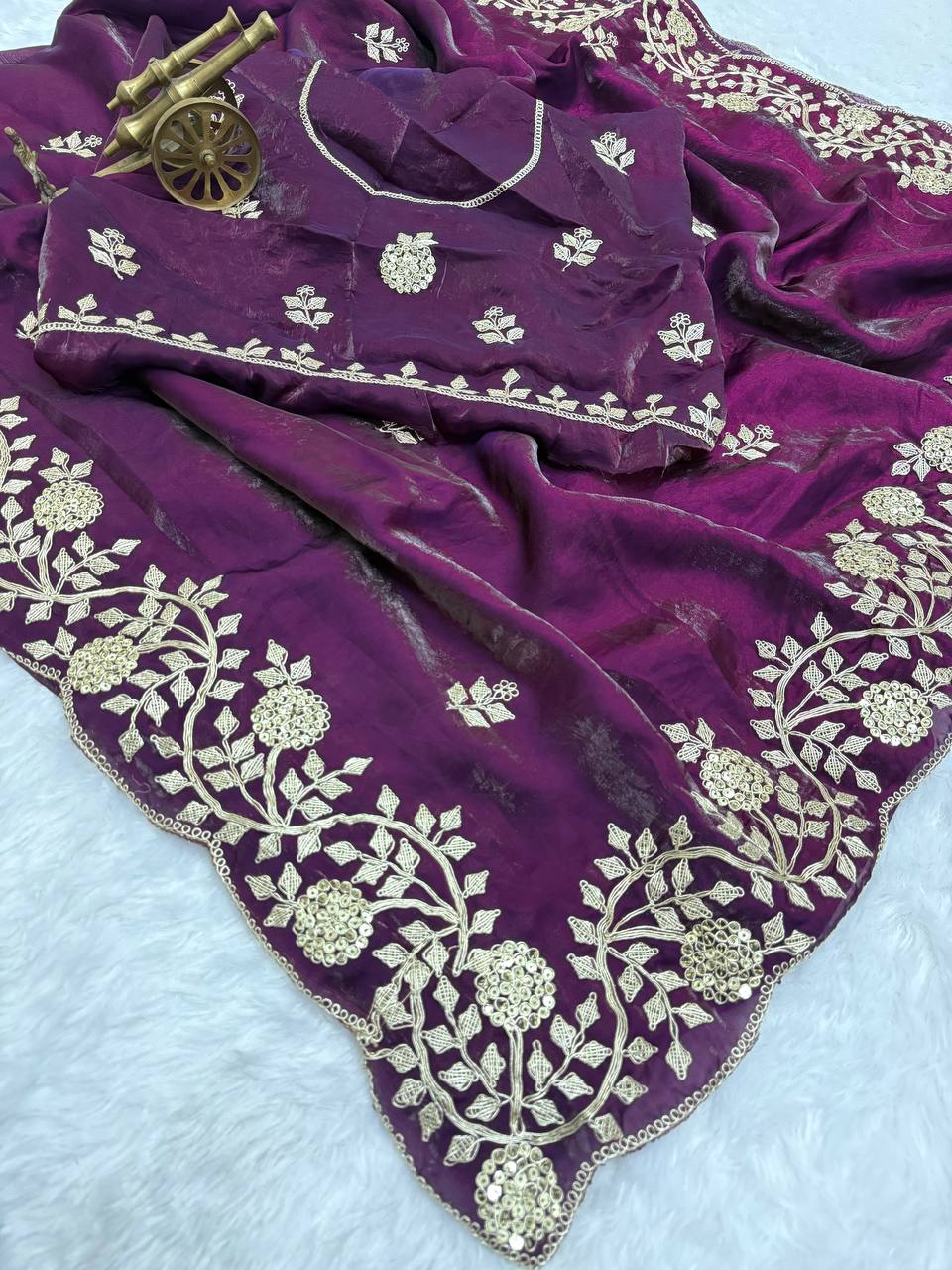 Premium Fancy Satin Saree with Embroidery Work | C Pallu & Arco Cut Border