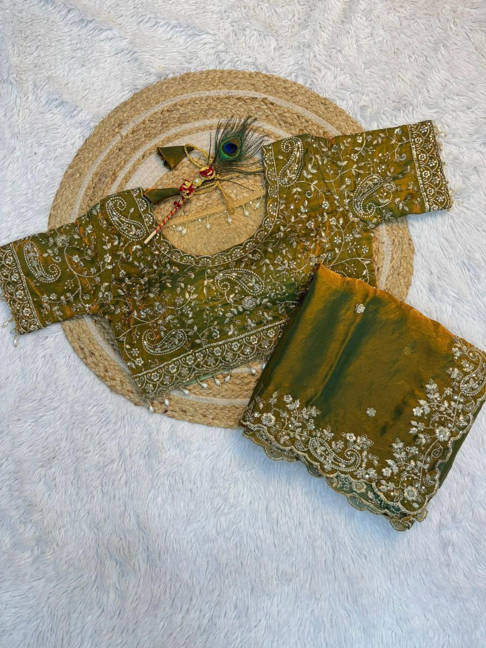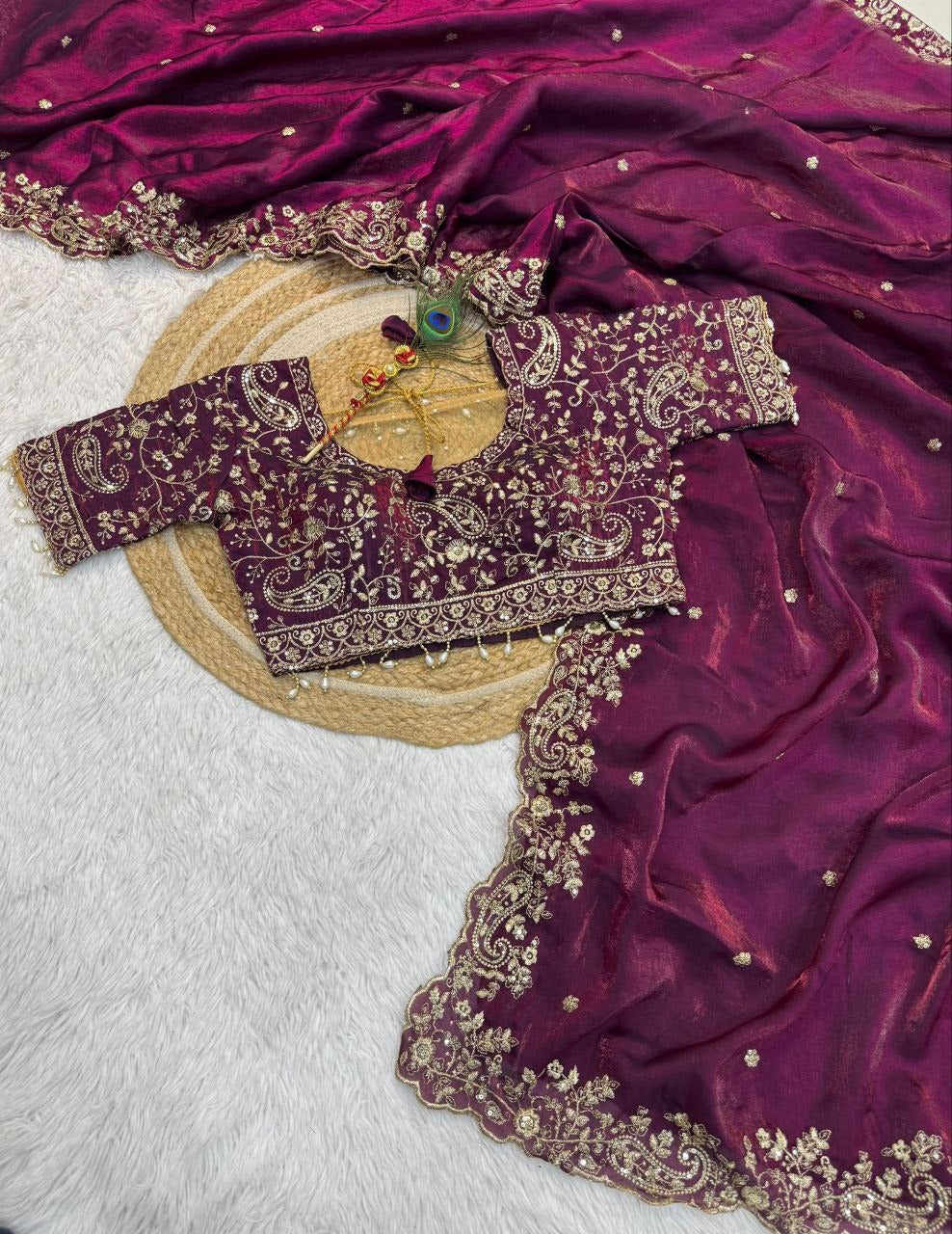 Premium Pure Space Silk Saree With Zari Sequence Mango Design Embrodairy Work