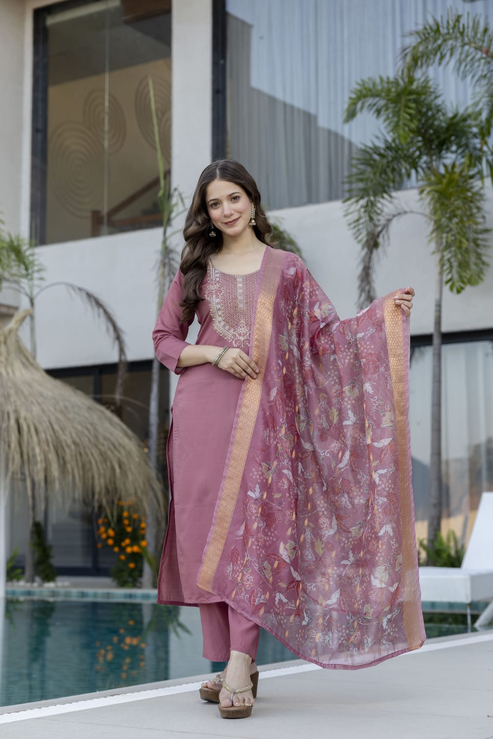 Pure Viscose Chanderi Kurta Set with Sequence Coding Embroidery Work