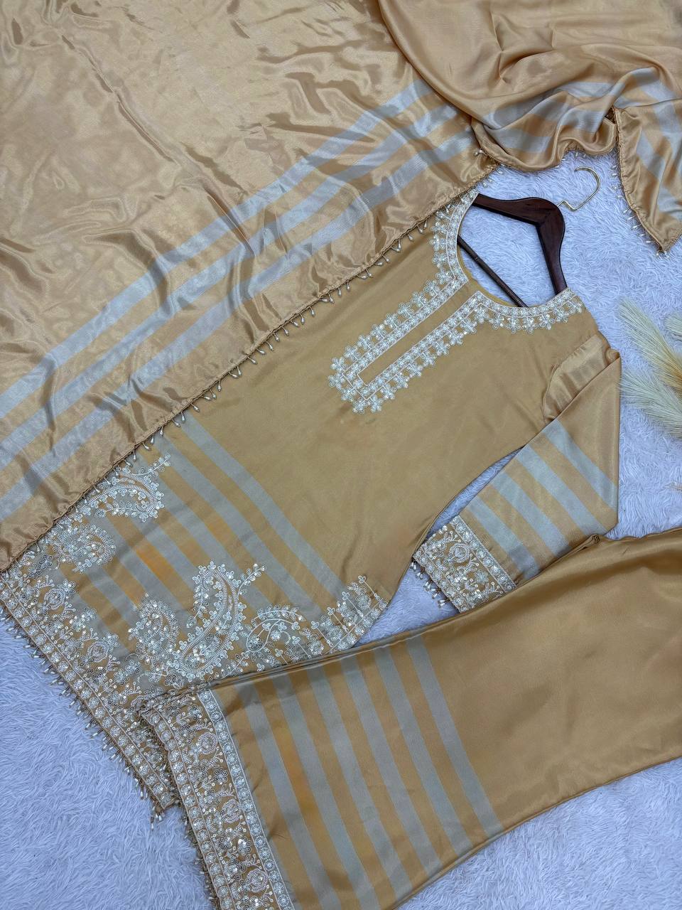 Stunning 3-piece Chinon silk suit set featuring beautiful embroidery work, sequence detailing, and digital print. This complete ready-to-wear ensemble is...