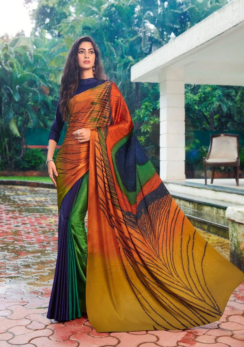 Fabric Details Saree: Premium satin silk with exclusive hand print and stone diamond work Experience the perfect blend of traditional...